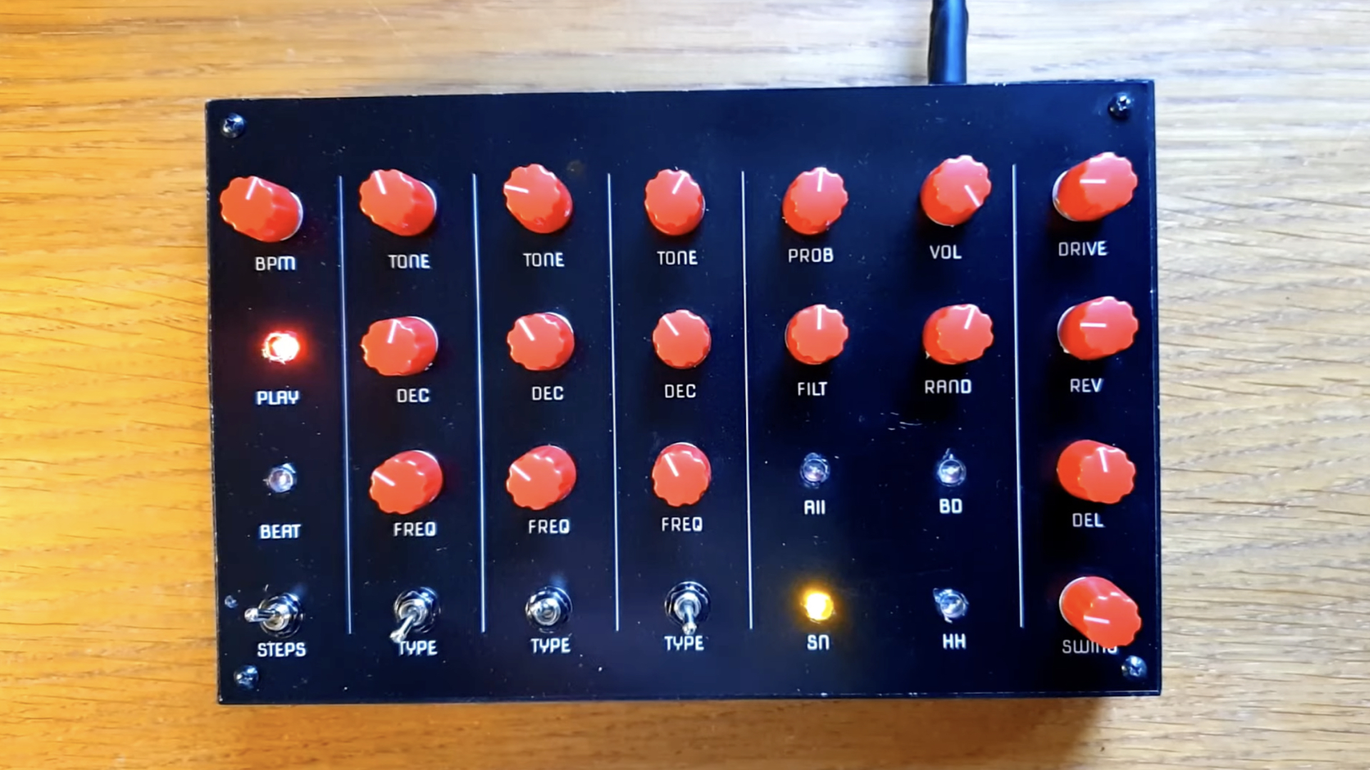 The developer did it without a fancy name. The instrument is simply called “Drum Machine” and is, as the name suggests, a portable drum machine. It is built around a Teensy 4.1 and other components, such as a UDA1334 DAC. The hardware design follows the same simplicity with a black housing, red knobs, a few switches, and lights.