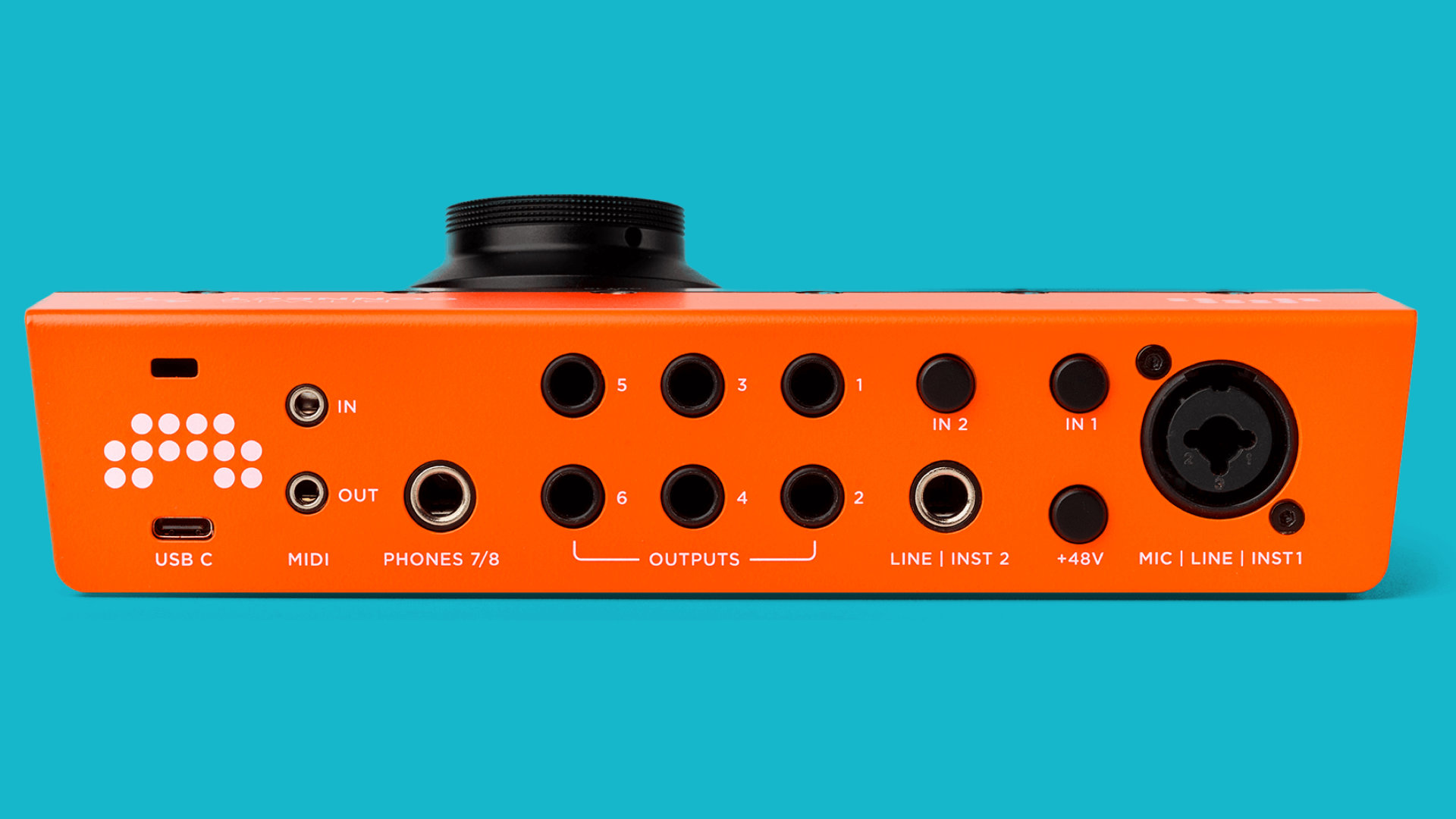 The heart of the new orange hardware is the front panel. It offers mode buttons and a 360-degree, touch-sensitive dial to adjust interface parameters or control software. You can set the input gain and adjust the volume levels for two sets of monitors and your headphones.
