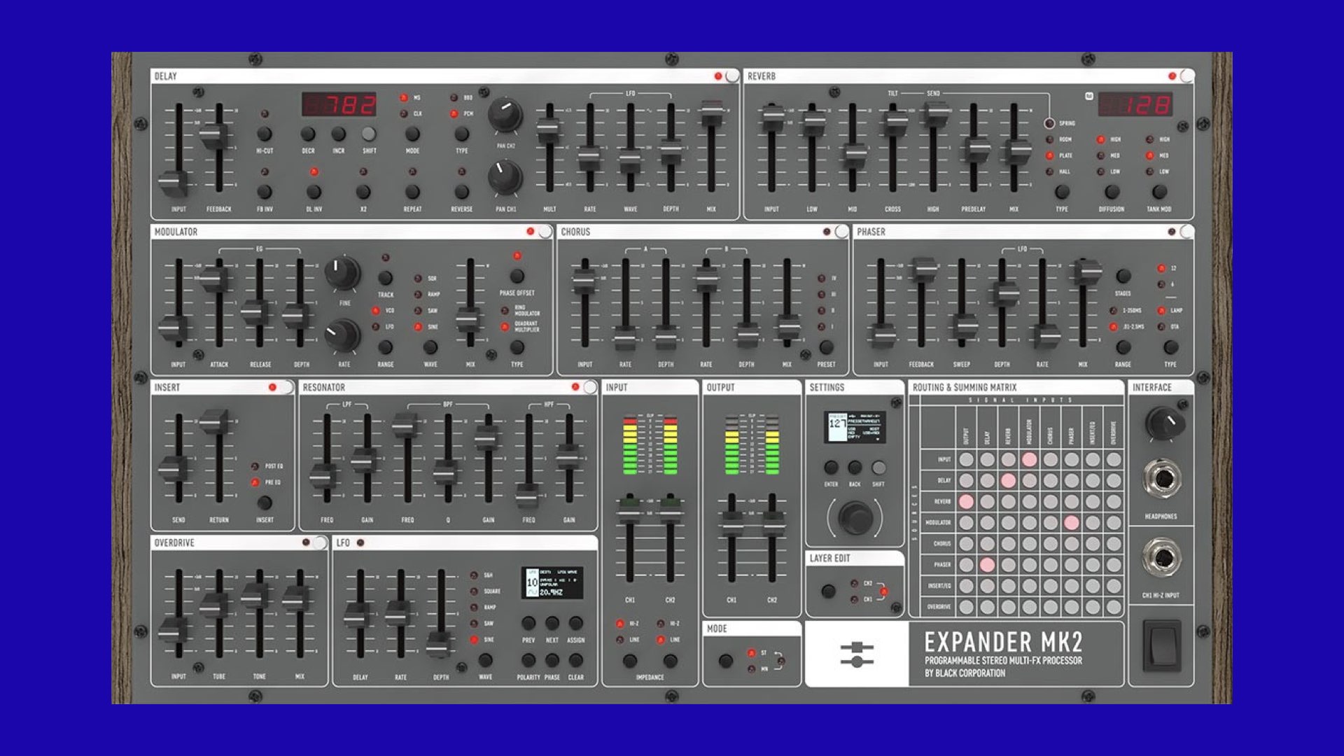 Expander MK2 is a tabletop or 6U rackmount stereo effects processor that combines analog and digital effects technology. The new Black Corporation product’s hands-on interface is a highlight.