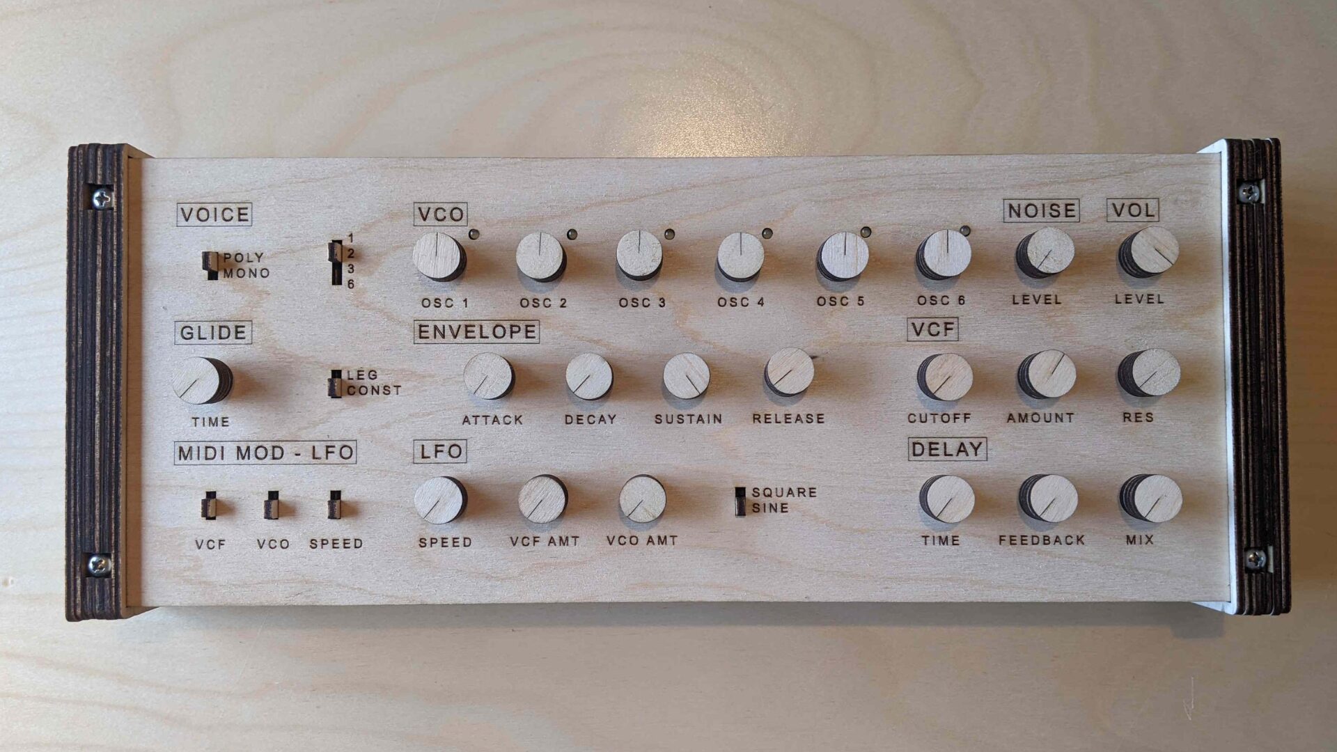 On the feature side, it’s a paraphonic synth with six analog voltage-controlled oscillators (VCOs) and six analog VCAs. It has individual controls for each oscillator. There is also a white noise generator using a linear feedback shift register.