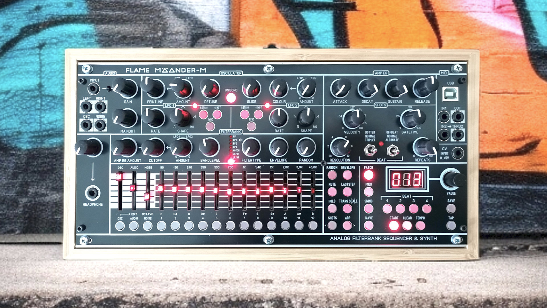 The Mäander from Berlin-based Flame Instruments is or was a special desktop Synthesizer. It combined wavetable synthesis with an analog filterbank as an engine and offered a sequencer. A later update added an FM engine and more wavetables. But then the Mäander was discontinued in desktop form.