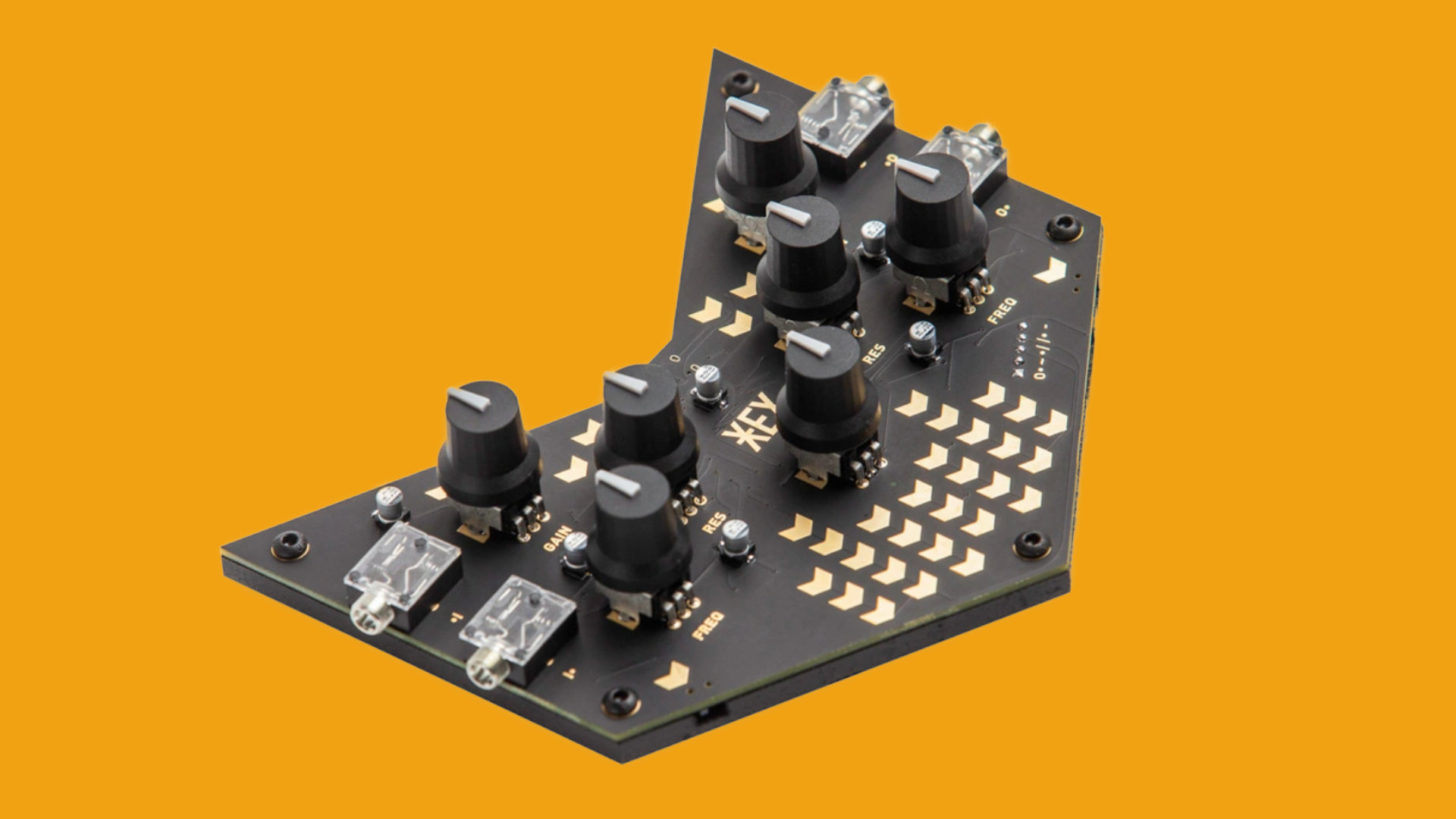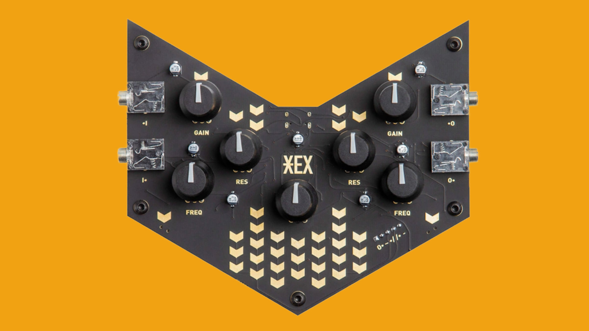 Each Hex row channel and filter can be controlled with three potentiometers: gain, frequency, and resonance. Gain sets the gain, which either attenuates or amplifies a signal x20. ¨