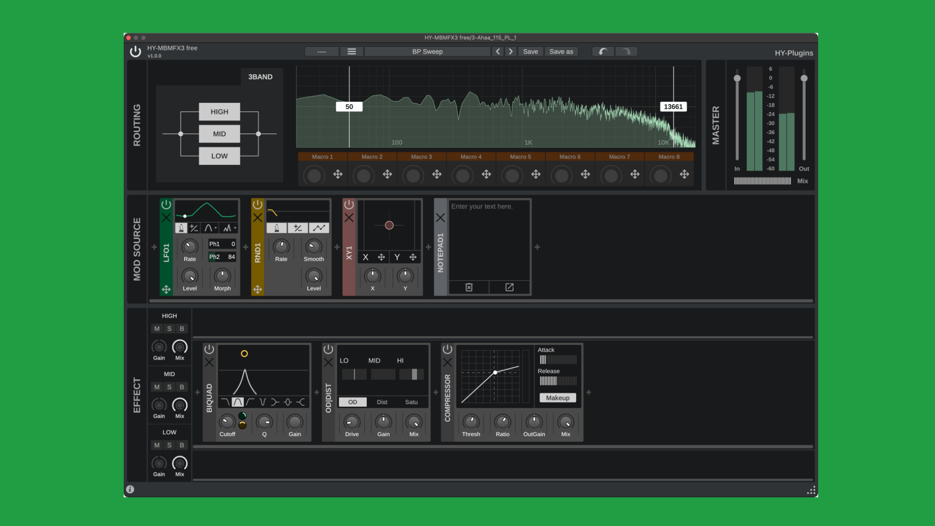 HY-MBMFX3 remains a multiband multi-FX plugin for macOS, Linux, and Windows. Just like the HY-MBMFX2, HY-Plugins has created a modular-style structure that lets you freely combine and route FX and modulation.