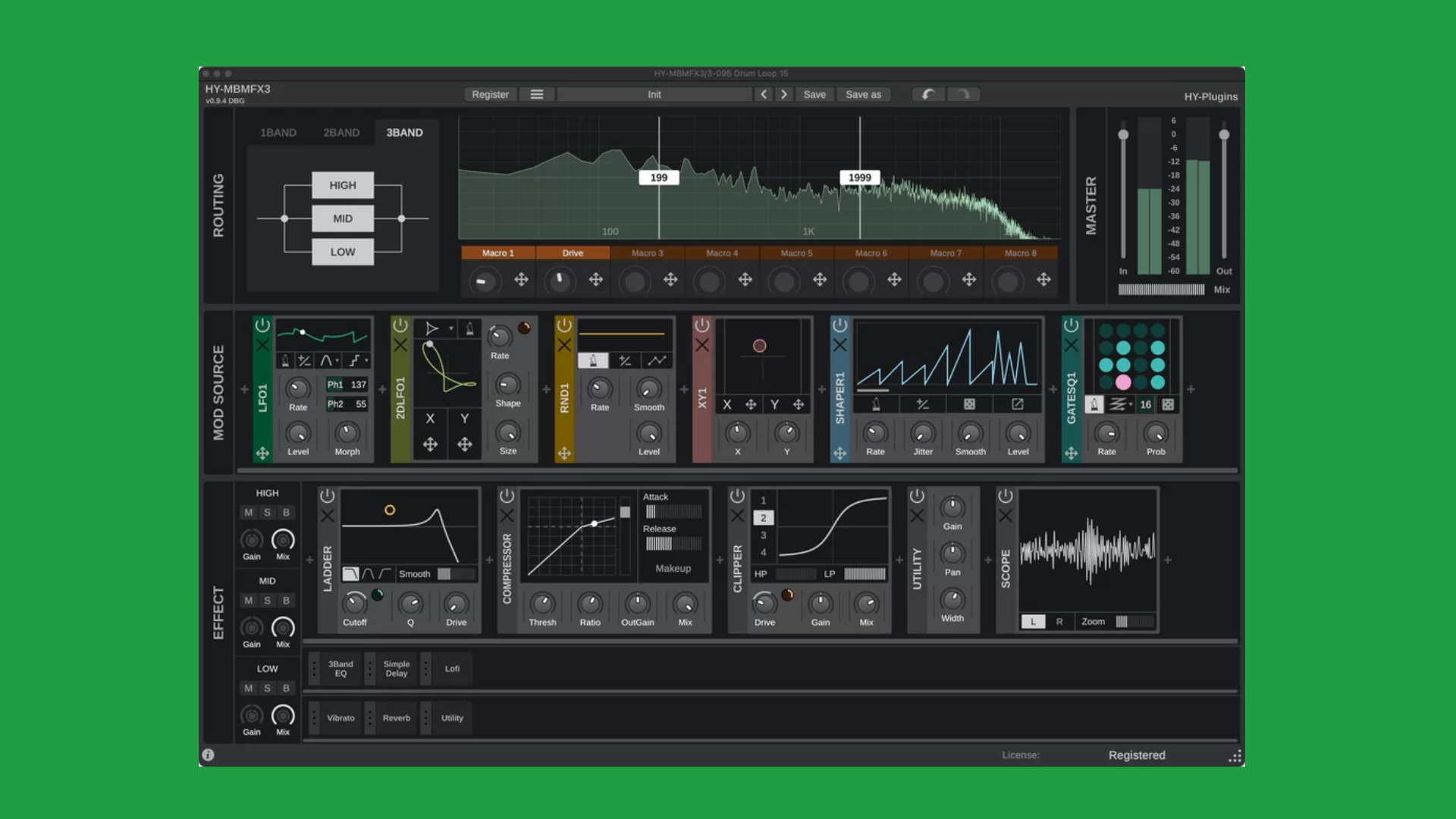 On the right top side, HY-MBMFX3 also hosts a master control section for adjusting the overall output and blending of processed and unprocessed signals. The plugin has a resizable UI and ships with various presets that showcase its capabilities.