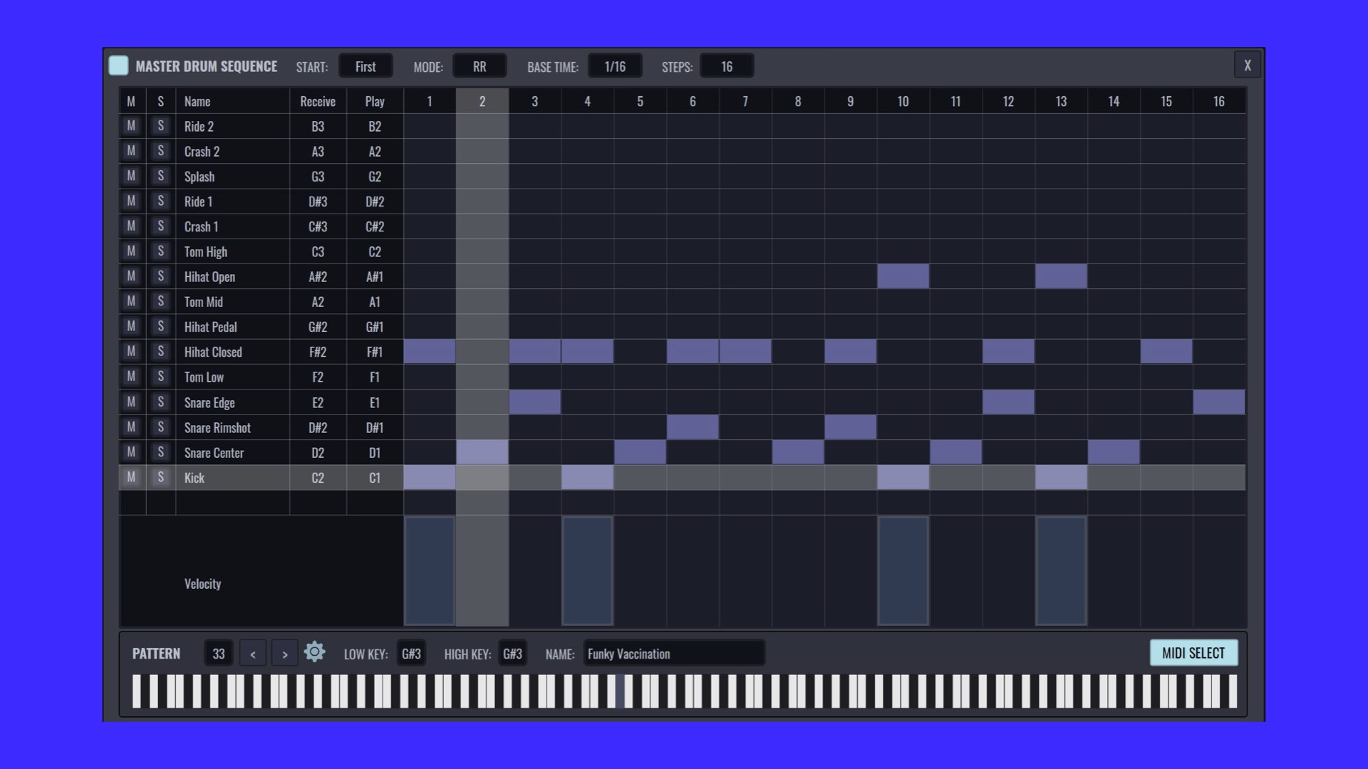 On the new dedicated drum sequencer page, you can edit entire drum patterns (up to 128 patterns) and trigger the instruments by playing different keys. The editor offers various handy functions, including copy, paste, duplicate, add, delete, load, or save patterns.
