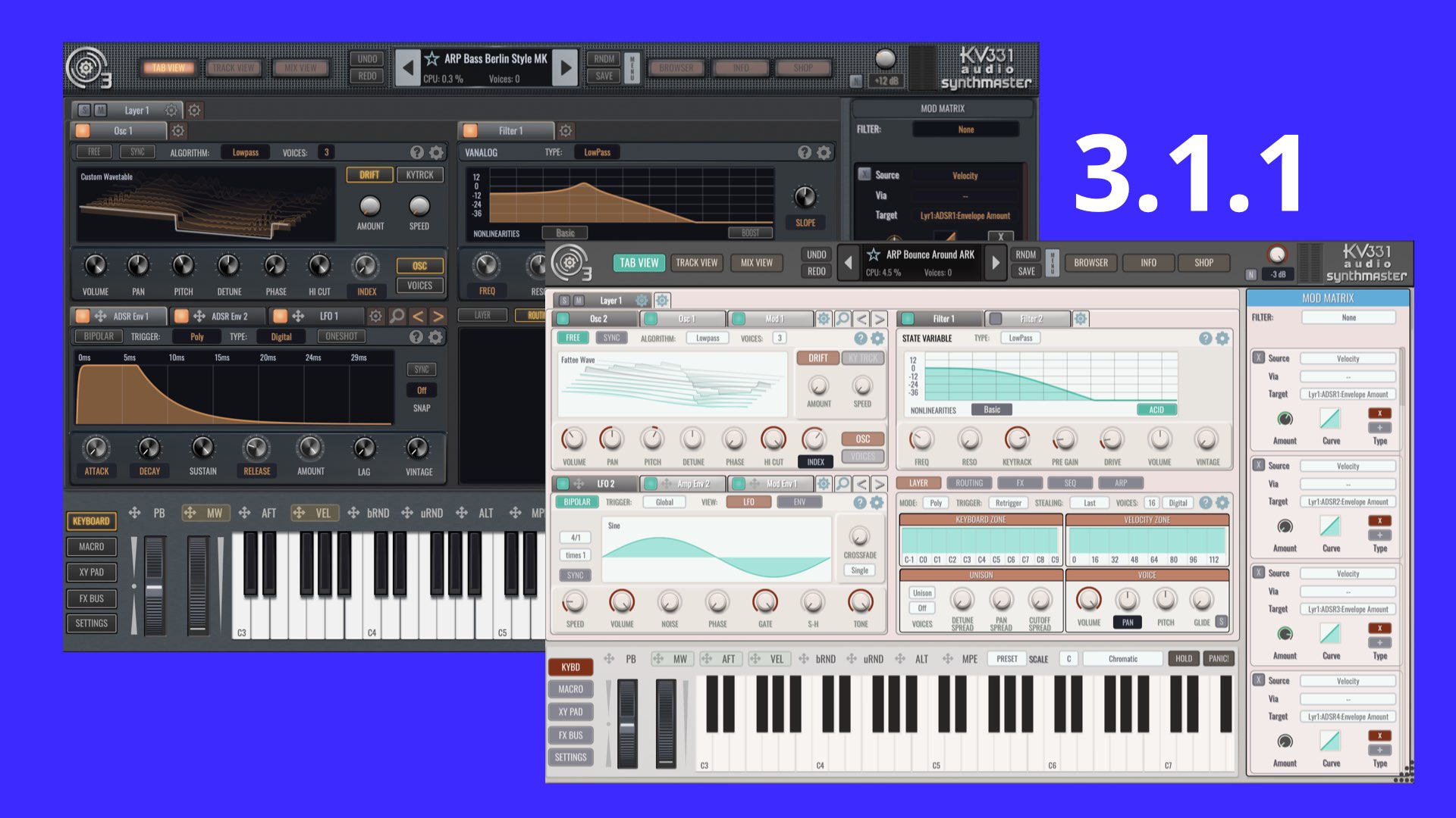 As a bonus, Synthmaster 3.1.1 ships 25 new drum-kit presets and 120 drum patterns designed by Gercek Dorman to showcase the new drum Synthesizer functionality. Plus, it includes 50 new analog-inspired patches by KV331 Audio founder Bulent Biyikoglu, demonstrating the new voice modifier parameters.