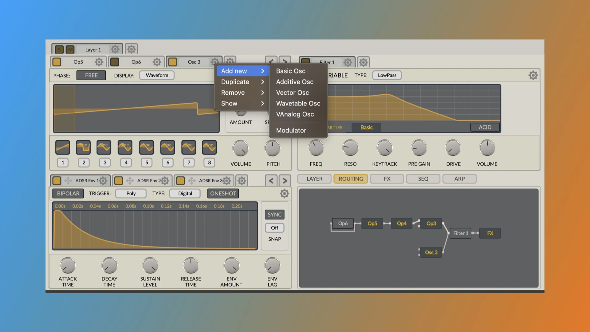 Routing within the layers is just as flexible. Individual functions are regrouped into dedicated layer modules (osc, mod, filter, operator, FX…) that can also be dynamically changed. You can connect the modules modularly (up to 16 per layer) and create complex patches.