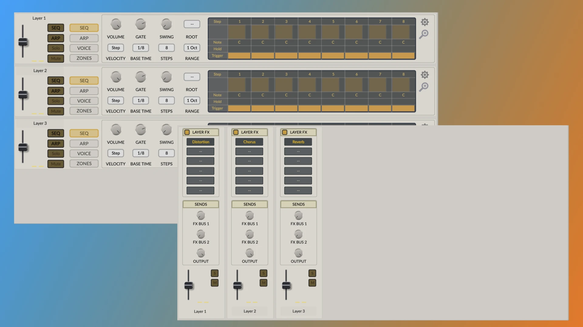 KV331 Audio has opened this up so that you can now easily build complete DX7 FM synths within one patch. The same flexibility also applies to the modulation sources, consisting of envelopes, LFOs, sequencers… You can have up to 32 sources per layer. That’s a lot of mod power.