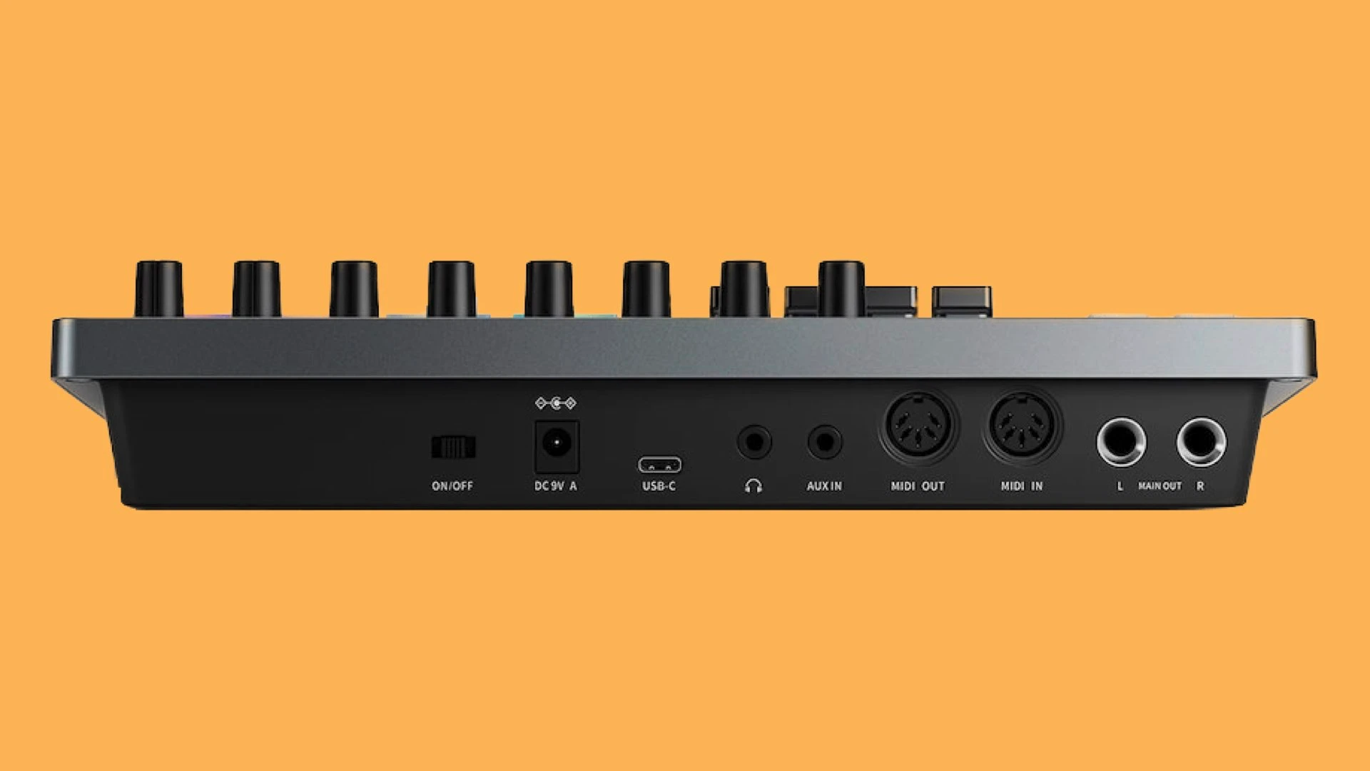 On the backside, you can find a power supply input, a USB-C port (USB-powered? no info), a headphone port, an aux-in, a MIDI interface (in/out), and a stereo output on L/R mono sockets. The design is strongly based on that of the B1 analog Synthesizer