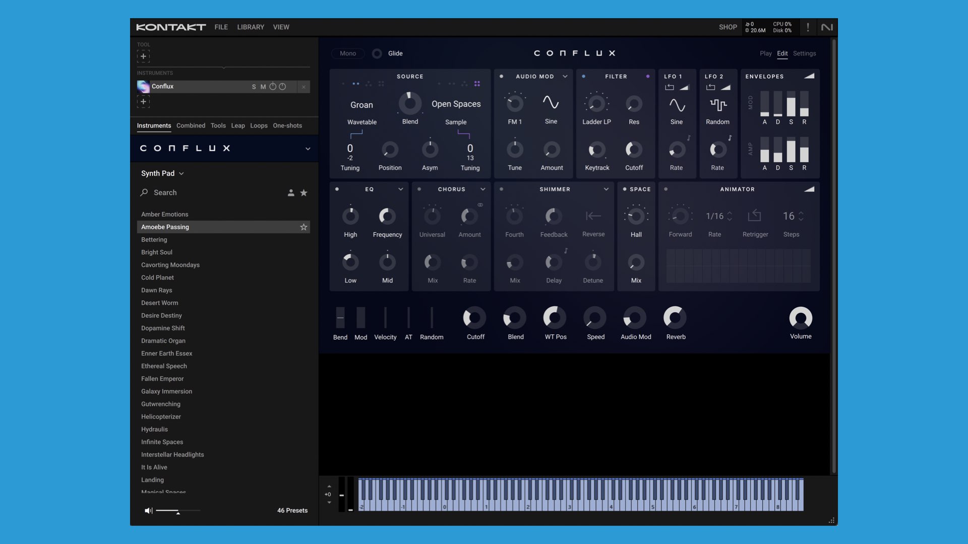 The new Conflux Synthesizer is the first Kontakt instrument to benefit from this extended wavetable engine. It offers an oscillator module, hosting a wavetable oscillator and a sample-based source that can be changed in position, shaped, and blended in real time.