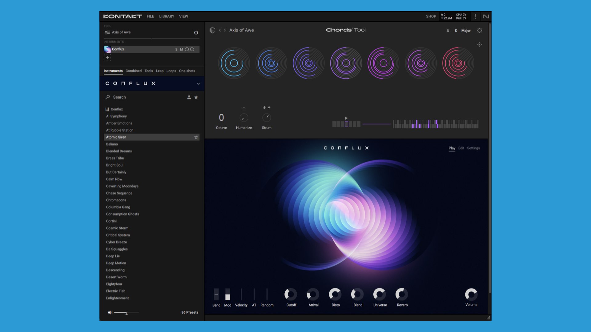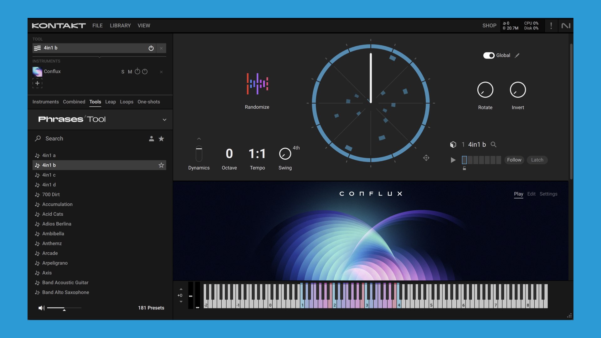 Regarding playing experience, Kontakt 8 has taken a significant step forward in two areas. Firstly, we welcome an all-new Tools section, which can be docked onto any existing Kontakt instrument. It consists of two MIDI tools: chords and phrases.