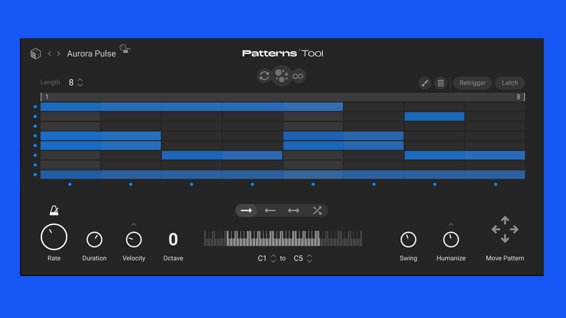 The new tool has various controls, allowing you to modify them in real-time, including tempo-synced rate, duration, velocity, octave, swing, and humanize. There are also handy retrigger and latch functionalities onboard.