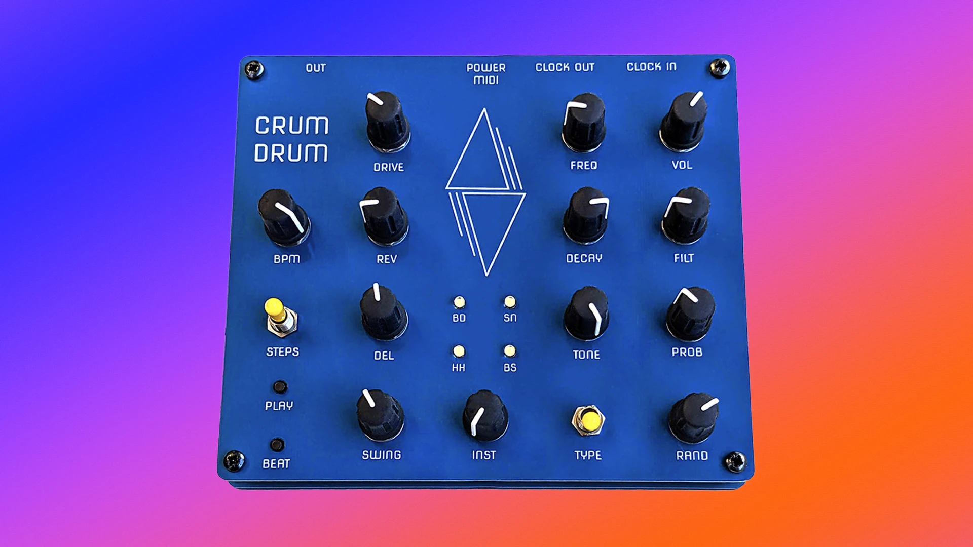 There is no classic drum sequencer. But the Crum Drum has an internal random sequencer. It can have 16, 32 or 48 steps in total. Press the beat button, and it generates new rhythms for you. The dedicated BPM knob sets the tempo of the internal sequencer and is a clock divider with external clock.