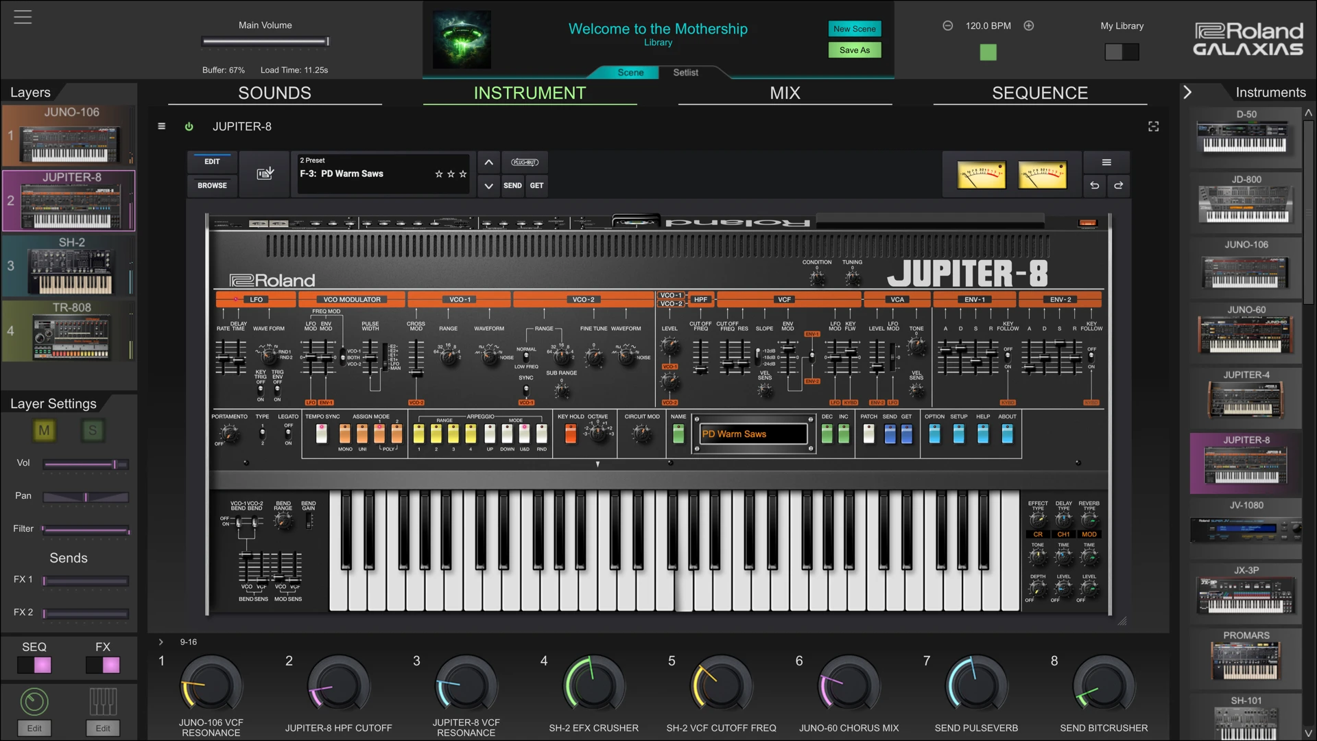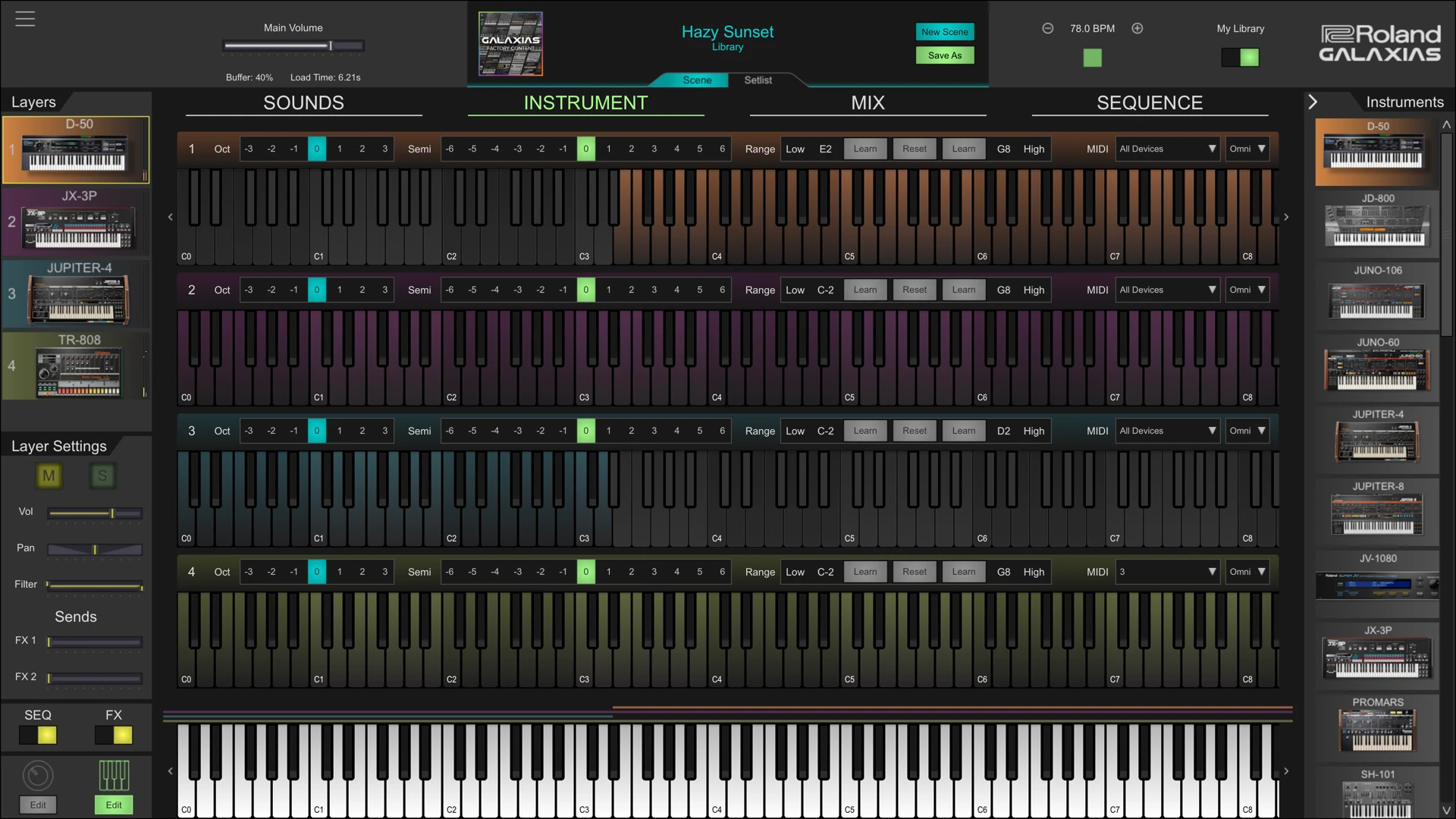 GALAXIAS consists of four sections: sounds, instruments, mix, and sequence. The sounds tab features an online sound browser in which you can easily browse through all the Roland Cloud content.