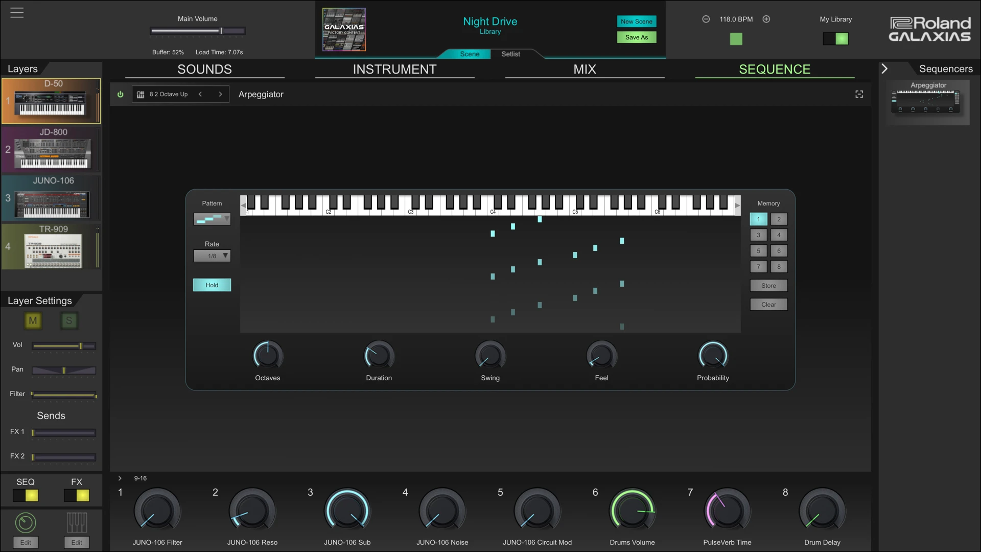 In the sequence tab, you can find an advanced arpeggiator per layer. It features various controls, including pattern selection, arp rate, octaves, duration, swing, feel, and probability. There are also eight slots where you can store your arpeggios.