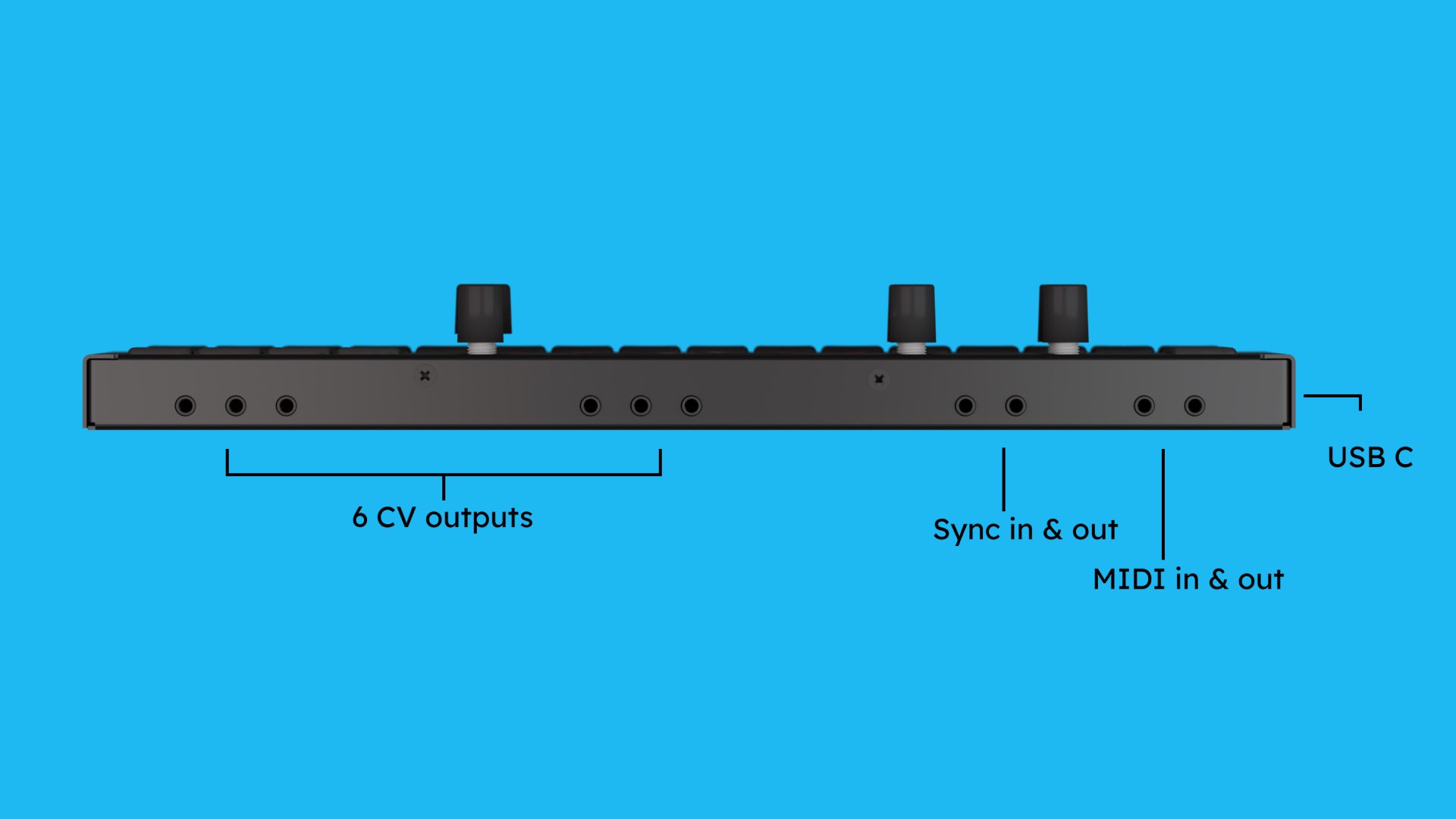 On the connection side, it has six CV outputs (3 CV + 3 gate), sync in & out, TRS MIDI in/out, and a USB-C port on the side. A very classic I/O setup, but I would have liked one more 1 CV/gate. There would be space in the housing.