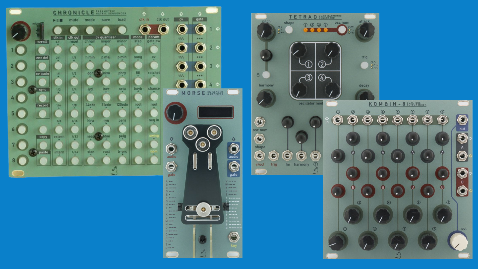 Tenderfoot is demonstrating just how colorful this module world can be with its four new modules: Chronicle, Tetrad, Morse, and KOMBIN-8. I’m not referring to the new smoother green tone and look of the modules. I’m just saying piep pieeep piep.