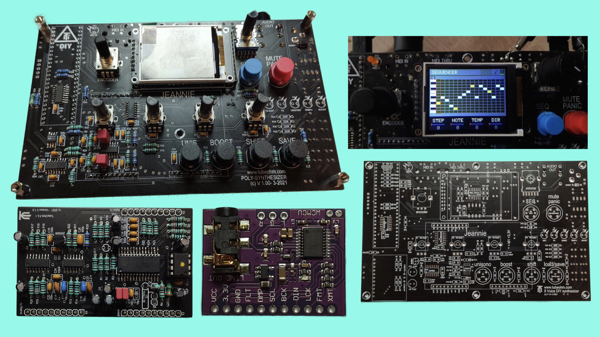 Jeannie is an 8-voice polyphonic DIY Synthesizer with two oscillators (sync, FM…), multimode filter, waveshaper, two envelopes, two LFOs, and a step sequencer. It consists of a DIY motherboard with a Teensy 4.1 (816 MHz), an optional DSP extension board for the effects, a housing, and a power supply (12V min 1A).