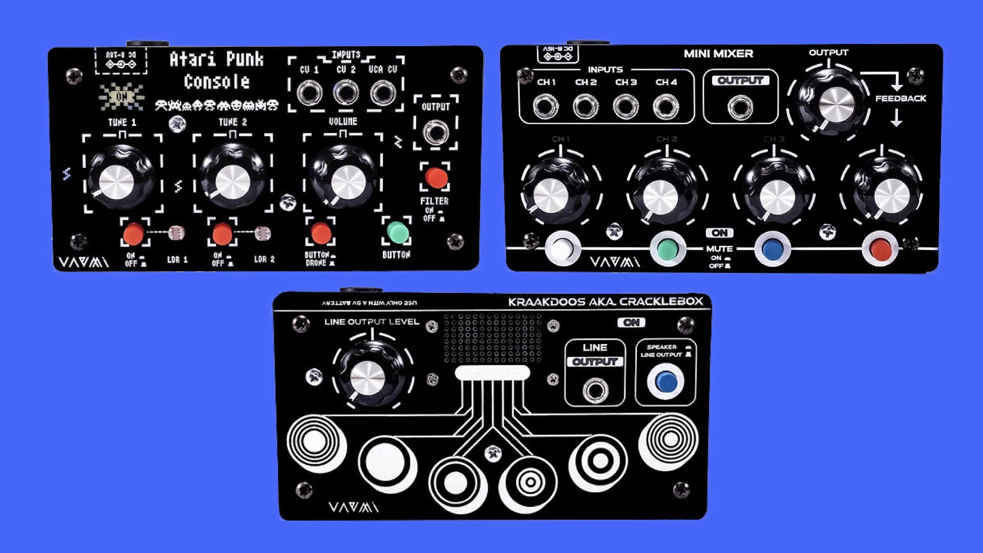Vaemi Kraakdoos, Atari Punk Console, and Mini Mixer are now available as DIY kits ($49 – $59) and assembled versions ($89).