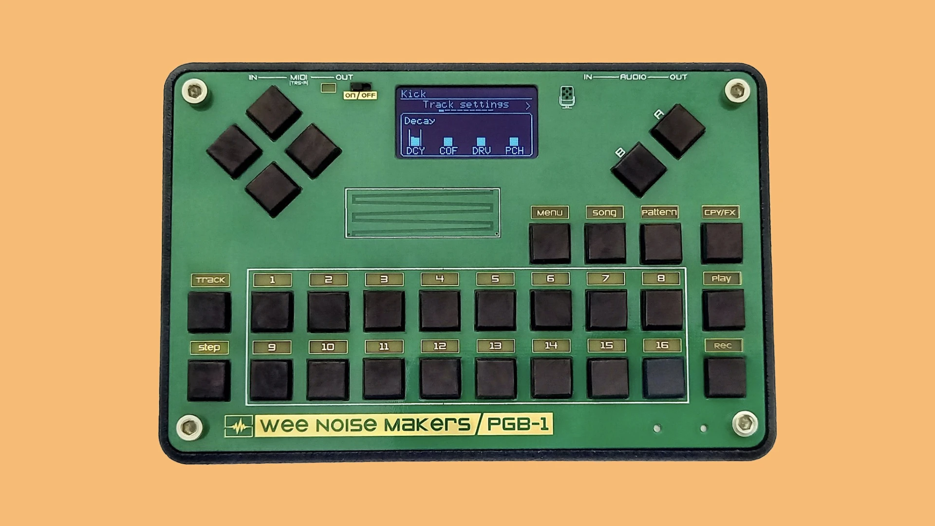 The stock firmware of the PGB-1 has 16 tracks that can be used with audio or MIDI. So, you can also use it as an external MIDI sequencer with other synths, making it one of the smallest MIDI sequencers on the market. And it’s pretty powerful.