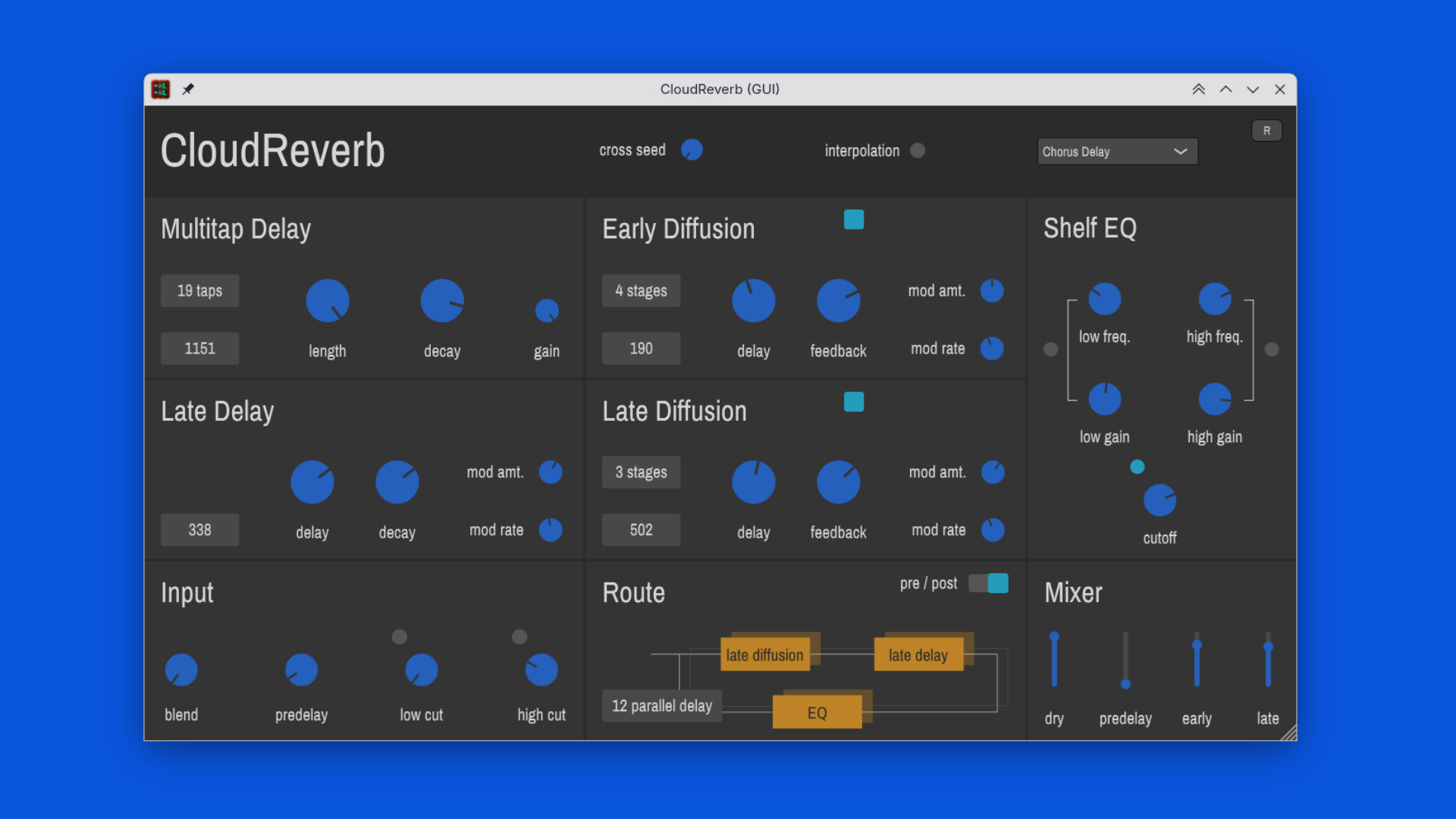 Further, a mixer melts all the elements (dry/wet mix, pre-delay, early, and late reflections) into a reverb. There is also a cross seed parameter that controls how the random values for the left and right channels are mixed.